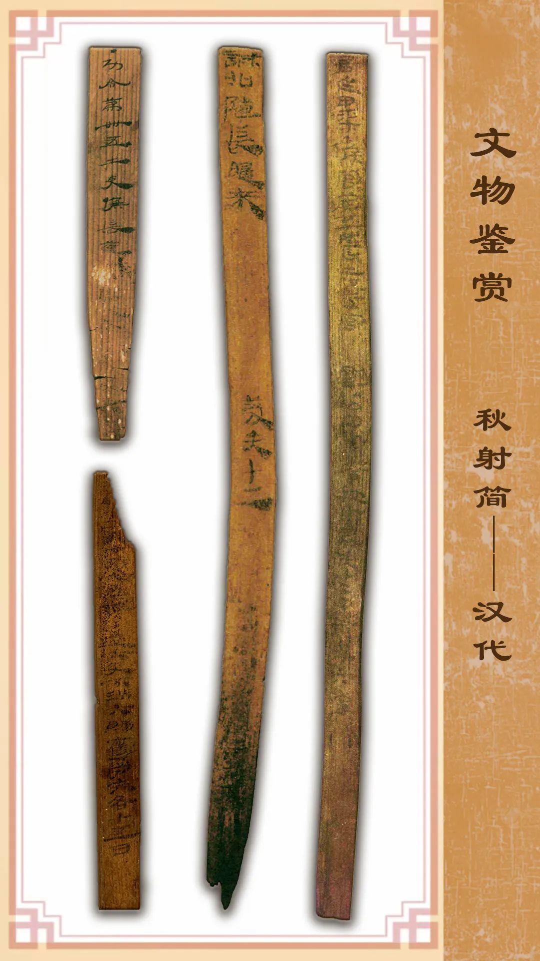 這是漢代邊塞有關(guān)“秋射”的一組散簡(jiǎn)(出土編號(hào)分別為:EPT52:95、EPT53:34/41、EPT11:1),都是一行書(shū)寫(xiě)。1974年出土于甲渠候官遺址。其中一枚簡(jiǎn)(EPT53:34)是關(guān)于邊塞軍官秋射考核的令文;兩枚簡(jiǎn)(EPT52:95、EPT53:41)是秋射考核記錄;簡(jiǎn)EPT11:1記錄了秋射賜勞的規(guī)定。