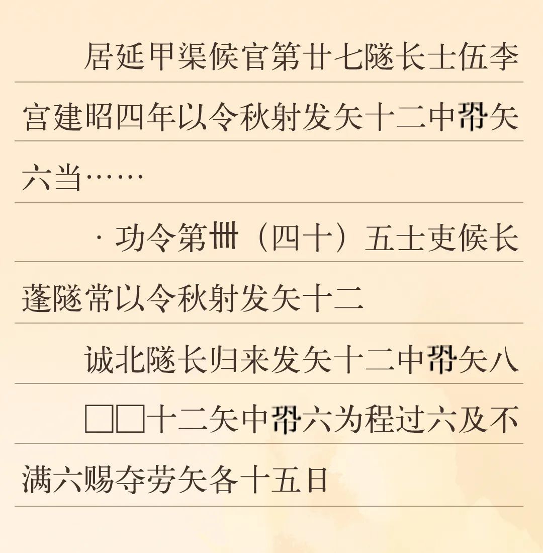 漢代對(duì)于官吏的考核分為文職和武職。文職主要考核書(shū)寫(xiě)能力、治理能力、財(cái)務(wù)能力、法律能力等;武職考核主要是一年一度的射箭考核,因?yàn)樵谇锛九e行,故稱為“秋射”,發(fā)十二箭,中六箭為合格(即“中程”)。河西邊塞的官府通過(guò)秋射這一活動(dòng),借以考察和檢驗(yàn)邊塞吏員們的軍事技術(shù)水平,并以此作為賜勞和奪勞的依據(jù)。為了提高吏員們的射箭技術(shù),邊塞官府還派專人來(lái)管理訓(xùn)練吏卒。邊塞參加秋射的主要是烽燧的燧長(zhǎng)、部塞的候長(zhǎng)、候官的候等吏員。