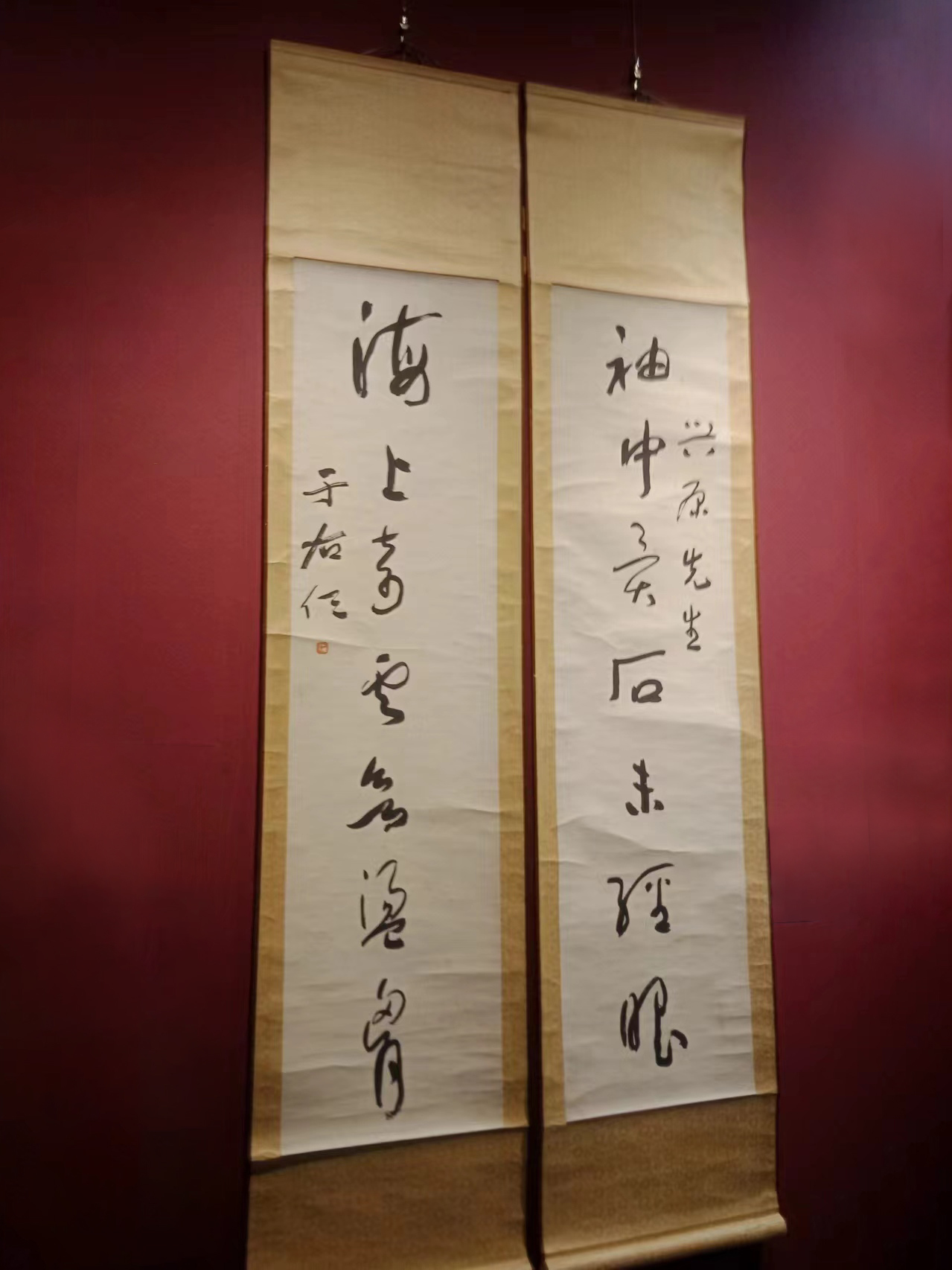 這次展出的于右任先生書(shū)法十余幅,有草書(shū)、行書(shū)和楷書(shū)。草書(shū)古詩(shī)“蜀本九經(jīng)最先出,后來(lái)孳乳到長(zhǎng)興。蒲津毋氏家錢(qián)造,海內(nèi)通行價(jià)倍增(此幅落款‘五十一年’,應(yīng)是1962年先生去世前的作品)”,行書(shū)七言聯(lián)“袖中異石未經(jīng)眼,海上奇云未蕩胸”,楷書(shū)七言聯(lián)“萬(wàn)卷藏書(shū)宜子弟,十年種木長(zhǎng)風(fēng)煙”等,書(shū)藝嫻熟,各有特色。所展墨寶筆法老練,墨氣逼人,筆者懷著崇敬的心情駐足敬賞,猶如與先生會(huì)面,久久不忍離去。