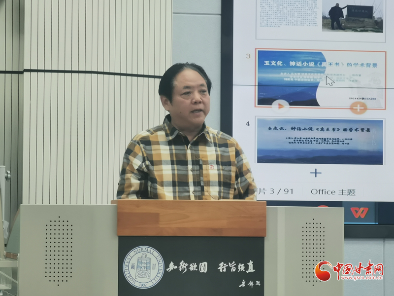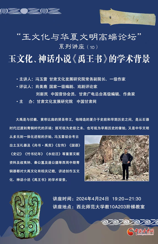 4月24日晚,馮玉雷講座“玉文化、神話小說《禹王書》的學(xué)術(shù)背景”在西北師范大學(xué)舉辦。這次講座是甘肅文化發(fā)展研究院和中國甘肅網(wǎng)聯(lián)合舉辦的“玉文化玉華夏文明高端論壇”系列講座第十講,也是近期啟動(dòng)的“巡禮馬銜山:玉文化與文學(xué)融合發(fā)展”系列活動(dòng)之一,甘肅文化發(fā)展研究院常務(wù)副院長、一級作家馮玉雷主講,國家一級編劇、戲劇評論家肖美鹿,中國音協(xié)會(huì)員、甘肅廣電總臺(tái)高級編輯、作曲家劉新民擔(dān)綱學(xué)術(shù)評議嘉賓。