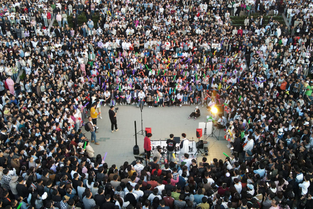 4月23日,在蘭州市城關(guān)區(qū)的黃河蘭州段近水平臺,市民及游客參與“蘭州黃河大合唱”活動(無人機照片)。新華社記者 范培珅 攝