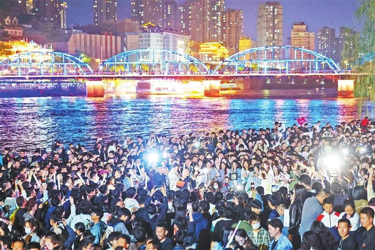 作為蘭州的地標(biāo)之一,中山橋已經(jīng)是來蘭游客必“打卡”的景點(diǎn)。火熱“出圈”的“黃河大合唱”成為蘭州旅游新體驗(yàn)。華燈初上,游客和市民齊聚黃河岸邊,隨著音樂齊聲合唱,場(chǎng)面壯觀,氣氛熱烈。“五一”假期首日,蘭州文旅市場(chǎng)迎來火爆“開門紅”,接待游客達(dá)到了86.42萬人次。