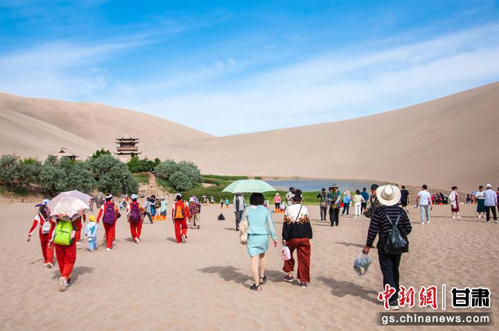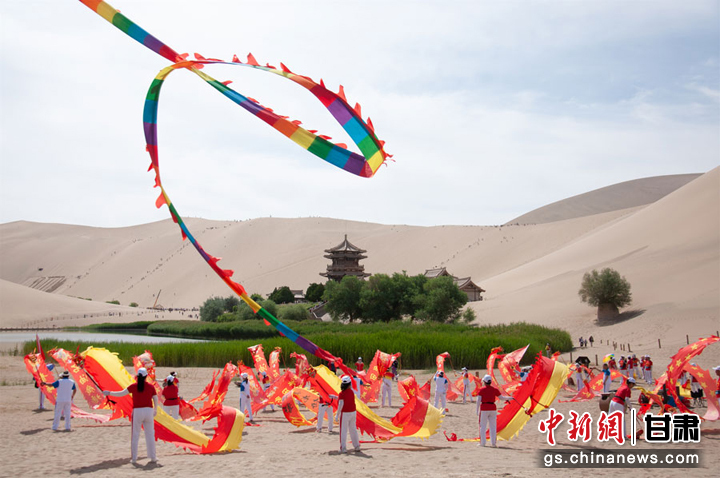 6月10日,敦煌市鳴沙山下,一場(chǎng)以敦煌市舞龍隊(duì)為首的20個(gè)健身舞蹈隊(duì)為廣大市民和游客獻(xiàn)上一臺(tái)臺(tái)精彩的舞蹈盛宴,吸引了眾多游客圍觀、拍照,在敦煌大漠度過一個(gè)難忘的端午節(jié)。王斌銀 攝