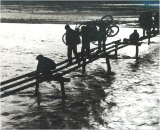 左圖為改造后的備戰(zhàn)橋,右圖為昔日涇河沿岸群眾搭建簡(jiǎn)易木橋過河的畫面?! 。ㄡ轻紖^(qū)檔案館供圖)