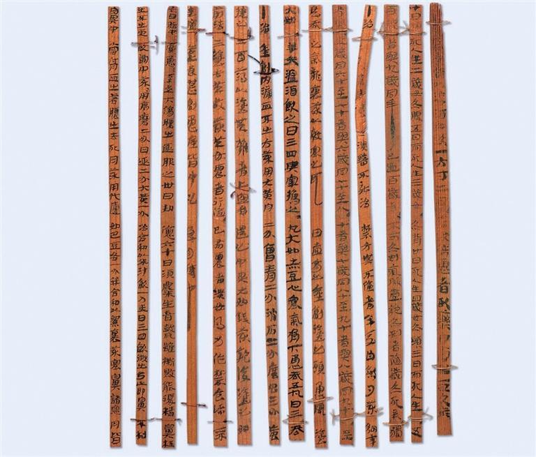 醫(yī)藥簡牘 漢代,1972年武威市旱灘坡漢墓出土,共計92枚,其中木簡78枚,木牘14枚。松木削制。簡文每簡1行,牘2—3行,多者達(dá)6行。從簡牘上遺留的痕跡看,簡有三道編繩,先編而后書,78枚簡為一卷冊??煞譃閮煞N:一種寬度為1厘米,簡的邊側(cè)有鍥口,簡文內(nèi)容是醫(yī)治內(nèi)科、外科、婦科及五官科的醫(yī)方,還有針灸方面的刺療醫(yī)術(shù)及禁忌;另一種寬度為0.5厘米,簡的邊側(cè)無鍥口,內(nèi)容是醫(yī)治各科疾病和疑難癥的醫(yī)方。 牘有二道編繩,先書而后編,14枚牘為一卷冊。簡書內(nèi)容豐富,抄錄當(dāng)時驗方,保存完整和比較完整的醫(yī)藥方有30多個,涉及內(nèi)科、外科、婦科、五官科、針灸科等,處方中所列藥物近百味。有些藥方還詳細(xì)記載了病名、病狀、藥物、劑量、制藥方法、服藥時間、用藥方式、針灸穴位以及注意事項等,是研究漢代臨床醫(yī)學(xué)、針灸學(xué)和藥物學(xué)的重要資料。