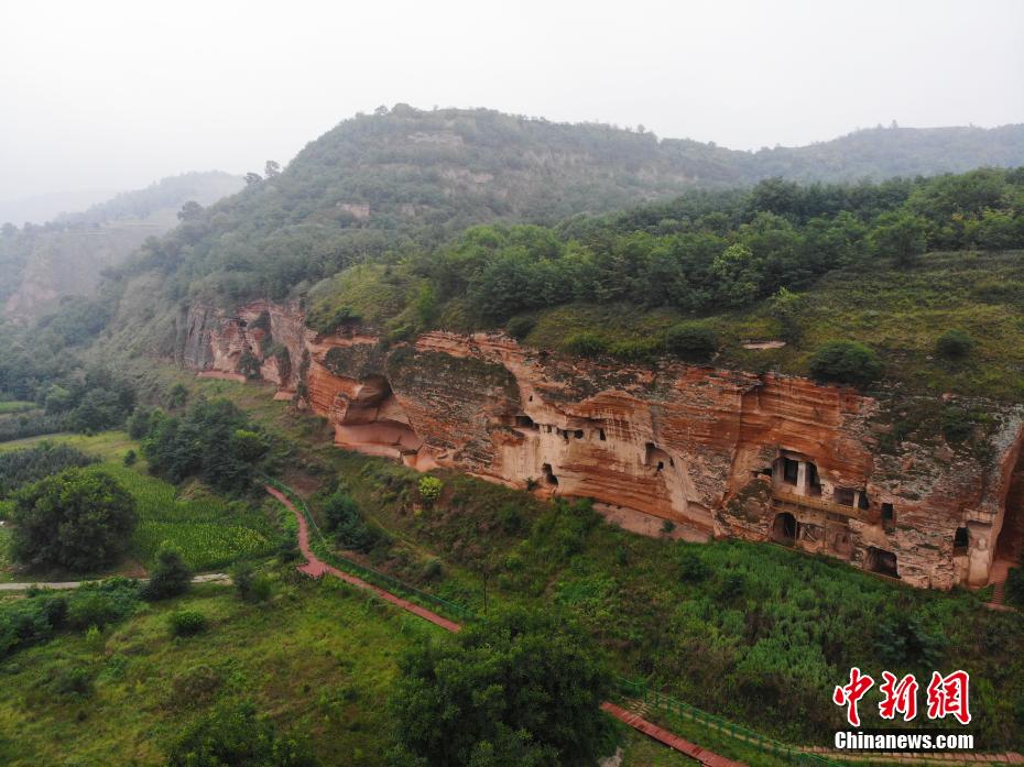 7月15日,航拍甘肅省平?jīng)鍪袥艽h百里石窟長(zhǎng)廊中的羅漢洞石窟。百里石窟長(zhǎng)廊位于涇川縣境內(nèi),由512個(gè)石窟、5眼窟中石井組成,現(xiàn)存王母宮石窟、鳳凰山石窟、南石窟寺、丈八寺石窟、羅漢洞石窟、太山寺石窟等規(guī)模較大的石窟群,還有數(shù)量眾多的小石窟群。羅漢洞石窟遺存40余個(gè)窟龕,以北魏至清代風(fēng)格為主。(無(wú)人機(jī)照片) 中新社記者 李亞龍 攝