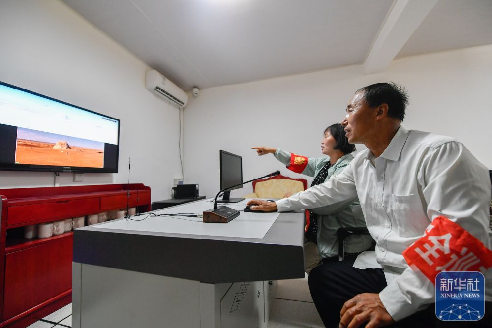↑7月16日,張吉全和妻子聞春瑜通過監(jiān)控巡查漢長城遺址。