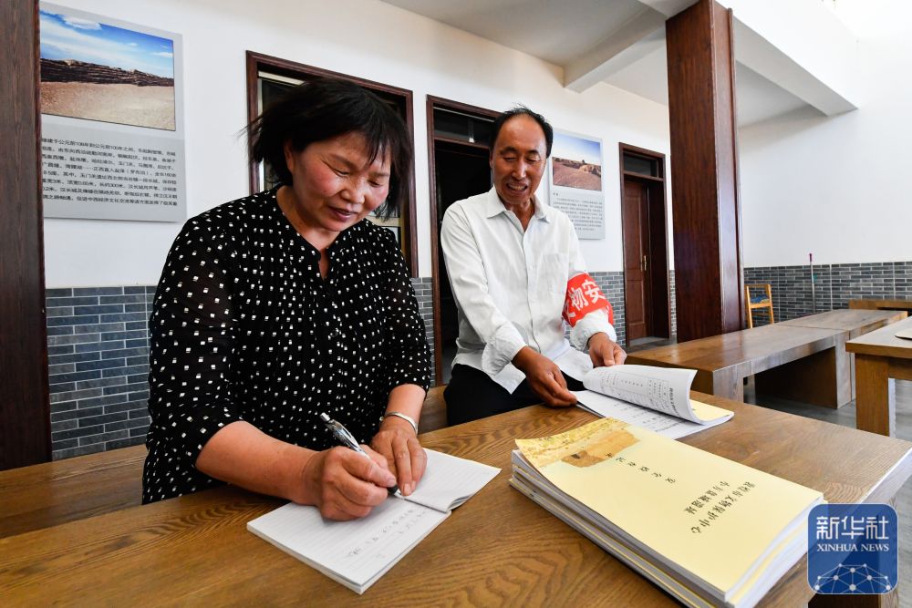 ↑7月16日,張吉全和聞春瑜在漢長城文物保護管理用房內(nèi)寫巡護日記。
