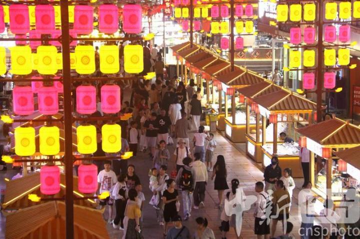 2024年8月17日,游客在甘肅省敦煌夜市游覽。進入暑期以來,被譽為敦煌“夜景圖”的敦煌夜市日均客流量達3萬人次以上,游客在這里賞景游覽休閑,品嘗地方名優(yōu)小吃,選購敦煌特色文創(chuàng)產品,感受敦煌文化魅力,夜經(jīng)濟活力四射。中新社發(fā) 張曉亮 攝