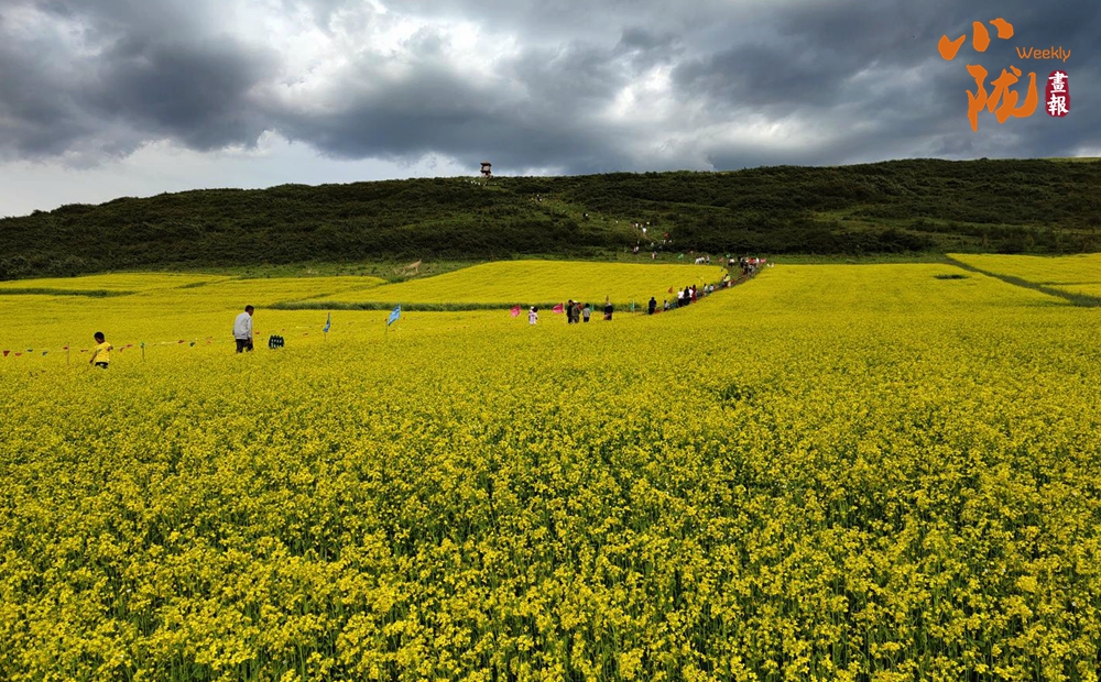 一場(chǎng)細(xì)雨過后,微風(fēng)吹拂,金黃色的花朵隨風(fēng)搖曳。游客們置身花海,賞花、拍照,盡情享受大自然饋贈(zèng)的田園詩(shī)意。