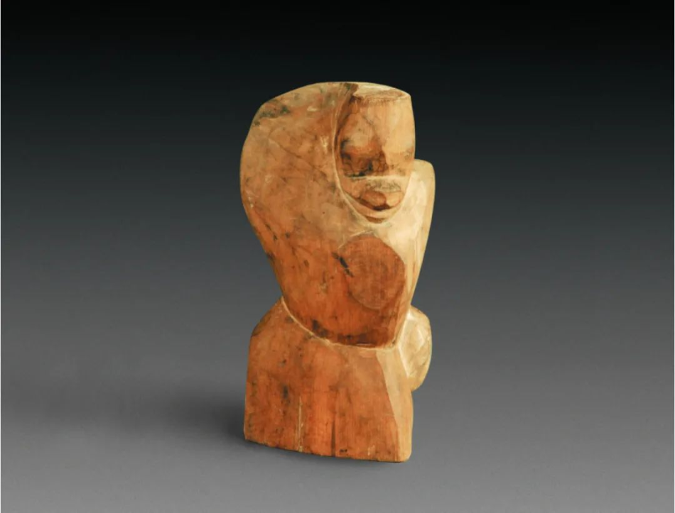 彩繪木猴,漢代,一級文物。武威市磨嘴子漢墓出土。寬 17.3 厘米,高 32.5 厘米。木質(zhì),由整木削制而成,全身施黑、白、紅三彩,木猴呈蜷縮、蹲臥狀,刀法簡潔質(zhì)樸,充滿藝術感。
