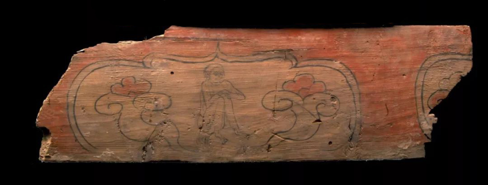 彩繪“猴”生肖木版畫,唐代,一級文物。1979年肅南縣大長嶺唐墓出土。木版畫長73厘米,寬22厘米,猴生肖木版畫呈長方形,墨筆雙線勾勒一壸門開光。壸門內(nèi)墨線勾勒一猴,其雙手環(huán)抱膝蓋至胸前,猴身兩側繪有兩朵升騰祥云。壸門外飾以土紅色。