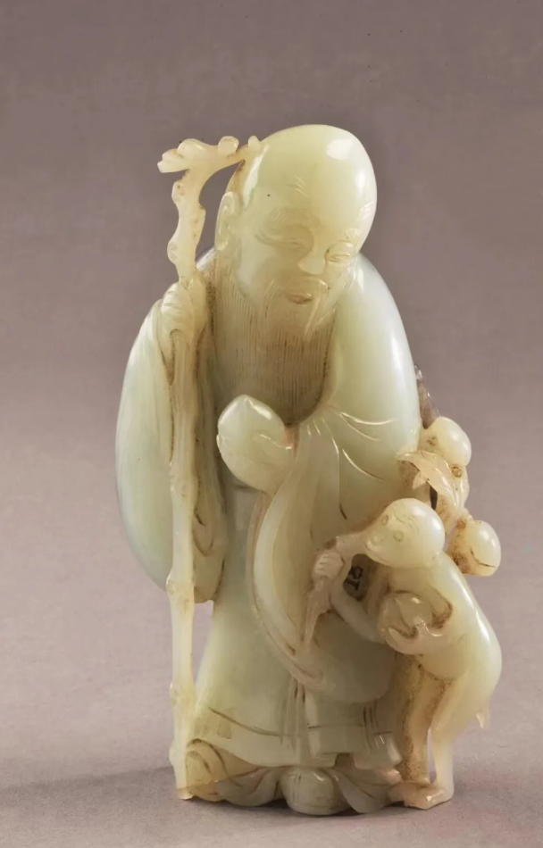 玉壽星,清代,高15.5厘米,寬9厘米,厚4.7厘米。用整塊和田青白籽料琢制,正面玉質(zhì)潔白溫潤,背部有黑灰泌色。壽星頭微左傾,桃額,慈目善眉,大耳長頸,著廣袖大袍,左手持壽桃,右手持龍首杖,袍下微露云頭履。左側有一躬身站立猴子,左臂抱一壽桃,右肩扛桃枝。玉雕為俏色雕刻而成,融圓雕、線刻、透雕等手法,將壽星的慈祥和小猴子的可愛表現(xiàn)于一體。
