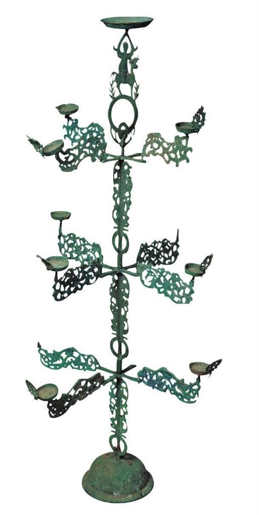 ▲1969年出土于武威市雷臺(tái)漢墓。燈呈樹形,由燈盞、葉、干枝和座等部分組成。燈座為覆缽狀,飾瑞獸紋和云氣紋。燈的主干為三段套插而成,每段均飾有連環(huán)和鏤空葉片,段與段銜接處各有一個(gè)十字形托架。十字托橫向四出,四端各飾透雕花葉一個(gè), 每層花葉紋飾各不相同,葉端承托小燈盞一只,燈盞外沿各有桃形葉飾一個(gè),象征火焰。主干頂端為鏤雕仙人騎鹿形花飾,仙人雙臂高舉托一大燈盞。原有燈13盞,現(xiàn)存9盞。