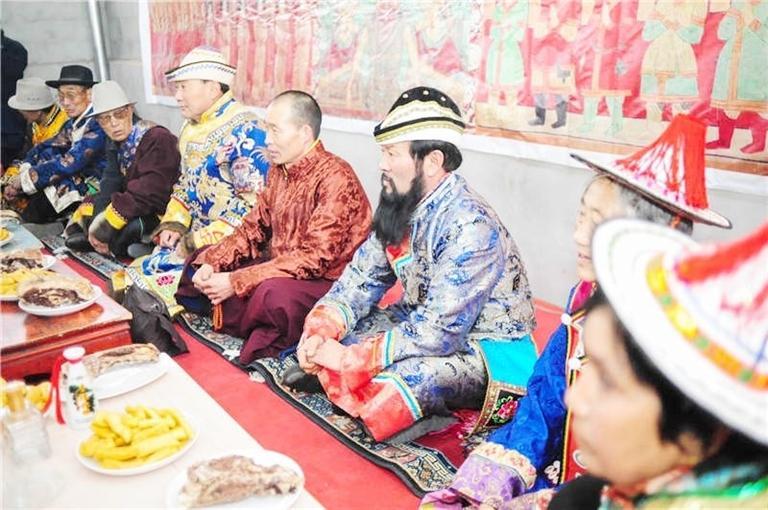 送親隊伍來到時,迎親的人們向女方客人贈送哈達,表示敬意。然后,送親的人下馬飲酒吃飯,謂之“打尖”。