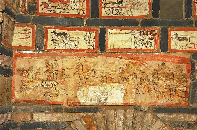 魏晉十六國(guó)磚畫(huà)在墓中的布局、組合,體現(xiàn)出 “滿”和“層”的特點(diǎn)。整個(gè)墓室,各方位、各邊角以及過(guò)道均鑲砌畫(huà)磚。以嘉峪關(guān)果園—新城5號(hào)墓畫(huà)磚的布局為例,各層間隔、同層緊鄰的畫(huà)磚,給觀者的感覺(jué)就是整幅壁畫(huà),但每一塊又是一個(gè)獨(dú)立的畫(huà)面,這種“樣式”,是魏晉十六國(guó)時(shí)期的河西匠工、畫(huà)工,在繼承漢晉磚室墓的同時(shí),將畫(huà)像磚在墓室布局的方式也加以接受。艷麗的色彩,“忠實(shí)”生活的寫實(shí)手法,又是河西畫(huà)匠們的創(chuàng)新和發(fā)揮。