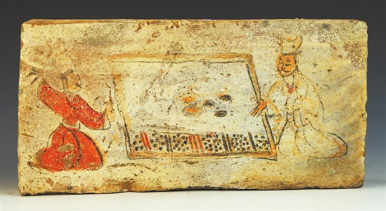 除此之外,河西彩繪壁畫(huà)磚圖像中,還有一些反映娛樂(lè)的圖像,主要有樂(lè)舞圖和六博圖。高臺(tái)地埂坡壁畫(huà)中的“角抵百戲”中,一著辮者在作表演,他小腿部網(wǎng)狀綁腿,蹲踞,雙手?jǐn)傞_(kāi),似乎是在表演魔術(shù),又似乎是在歡迎到場(chǎng)的人們。“擊鼓”中,兩人網(wǎng)狀繃腿,髡發(fā)梳辮,著黑裝者背鼓,著紅裝者持雙鼓槌準(zhǔn)備擊鼓。孫機(jī)先生謂,戰(zhàn)國(guó)迄漢盛行六博,博具和博戲的圖像在考古資料中不乏其例。甘肅以武威磨嘴子漢墓出土木六博俑為例。六博俑以簡(jiǎn)單明確的藝術(shù)造型,刻畫(huà)了兩個(gè)老者全神貫注博弈的場(chǎng)面,惟妙惟肖地表現(xiàn)出對(duì)弈時(shí)蓄勢(shì)待發(fā)的場(chǎng)面。在高臺(tái)壁畫(huà)墓中的博戲場(chǎng)面略有不同,二博者戴船形帽,打手勢(shì)。從相貌看,很可能是少數(shù)民族。高臺(tái)出土彩繪壁畫(huà)磚上,兩人動(dòng)作幅度更大,左邊一人的黃紅色著裝和博具上的零散物品,顯得場(chǎng)面更為熱烈激情。