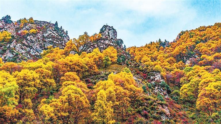 一場(chǎng)細(xì)雨,把漫山遍野深紅色與金黃色沖刷得更加明亮,透過(guò)秋霧的遠(yuǎn)山,伴著秋雨的落葉,石門溝別樣的秋景令人心曠神怡??粗矍暗木跋?,不由得想到初夏的石門溝,那時(shí)的石門溝,滿山的杜鵑花開得正旺,遠(yuǎn)遠(yuǎn)望去,山坡就像是從天而降的紫色瀑布。而深秋的石門溝,卻是另一番景象。