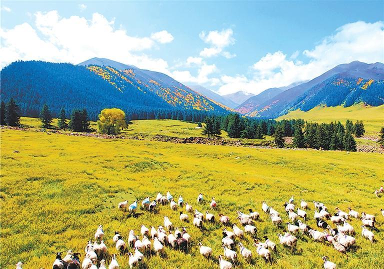 走進景區(qū),映入眼簾的便是布爾智峽谷,其重巒疊嶂,造型奇特。進入峽谷,豁然中開,地勢平坦,視野開闊,形成五山匯集的盆地景觀,一條悠悠的小河穿過盆地的胸膛,明亮清澈。遠山白雪皚皚,山腰云杉參天,山下灌木叢生,蒼翠蔥郁,山底蒼蒼茫茫的草原上,不時涌動著潔白的羊群。徜徉于廣袤的草原,便真正體味到“鳥的世界,花的海洋”的博大內涵。