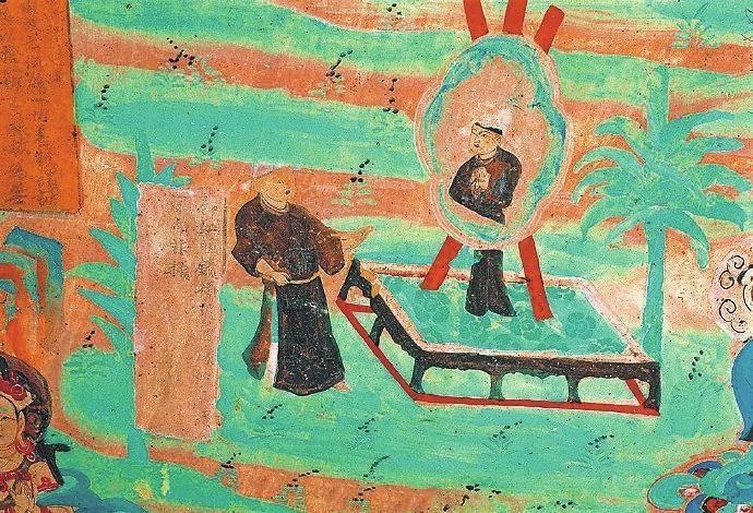 戰(zhàn)國時期楚國詩人屈原在《漁父》一文中寫道:“吾聞之,新沐者必彈冠,新浴者必振衣。安能以身之察察,受物之汶汶者乎?”意思是說我聽說剛洗過頭的人一定會去彈彈帽子上的灰塵;剛洗過澡的人一定要抖抖衣服的灰塵。怎能讓清白的身體去接觸世俗塵埃的污染呢?當(dāng)年的敦煌人走出溫泉,在身心放松之后,就該靜觀返照自己了。在莫高窟第85窟中有一幅“曲花式鏡圖”:畫面上在一個正方形鏤空的底座上擺放著一個巨大的曲花式鏡,鏡子式樣別致,明亮澄澈。藍色的曲花式樣引人矚目。但畫面上最吸睛的是一位魁梧俊朗身著一襲赭色長袍的男子,他正在鏡子前仔細地打量自己,而鏡中映射出他神情凝重的情態(tài)來。原來,古人照鏡除了正衣冠之外,還有反觀自照的含義,在鏡子前良久地注視自己,就是對自己反省、頓悟的過程。“一年好景君須記”,走過四季,到了歲末,該是每個人回望來時路,展望前方的時候了。