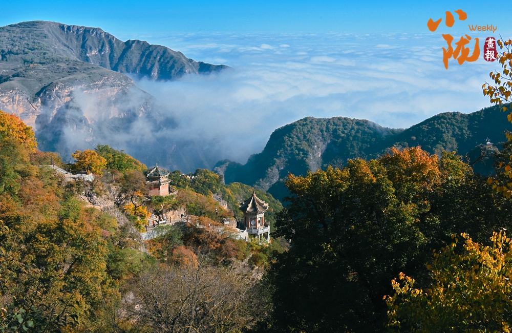 一葉知冬,遍地金黃。五彩斑斕的林木與古香古色的建筑、遠處的山巒云霧相映成趣,盡顯詩意之美。