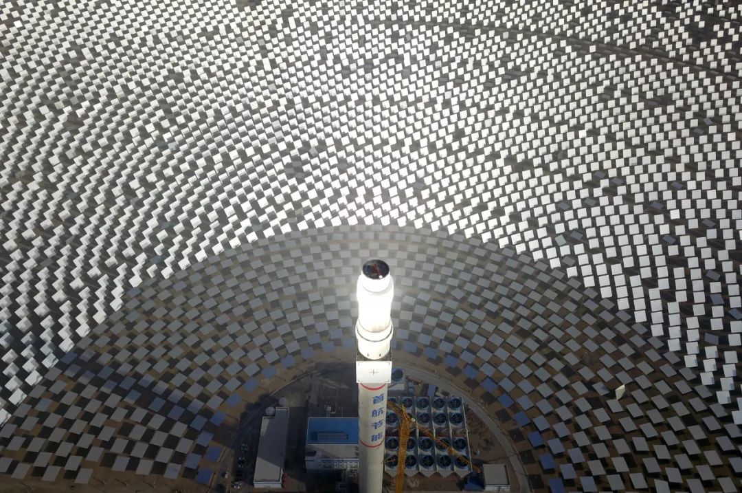 人們驚呼,這是自然力與人類智慧的完美創(chuàng)造:戈壁荒灘上“種”出了人造太陽。這個100兆瓦熔鹽塔式光熱電站,占地面積相當于780個足球場,每年所生產的綠電可減排35萬噸二氧化碳。