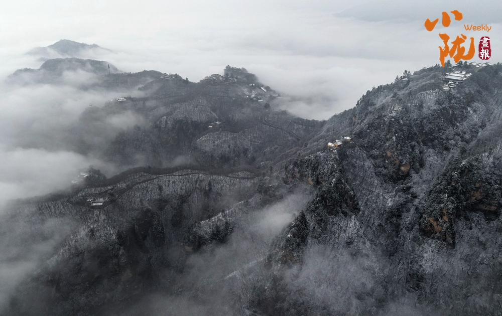 輕薄的雪花落在崆峒山巔,銀裝素裹下的樹木古剎和山下的湖泊美景分外迷人。