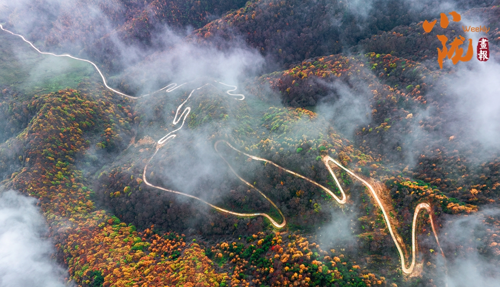山巒起伏,彩林密集,鋪滿整座山谷。山巔公路宛若玉帶鋪成開(kāi)來(lái),橫貫蒼茫的林海之上,直通天際。