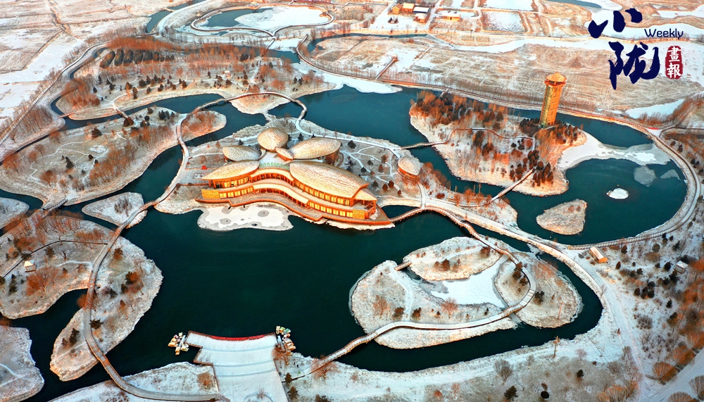 濕地公園白雪皚皚,景色如畫,湖面開始結(jié)冰,形成各種形狀的圖案,如同大自然的“畫作”。