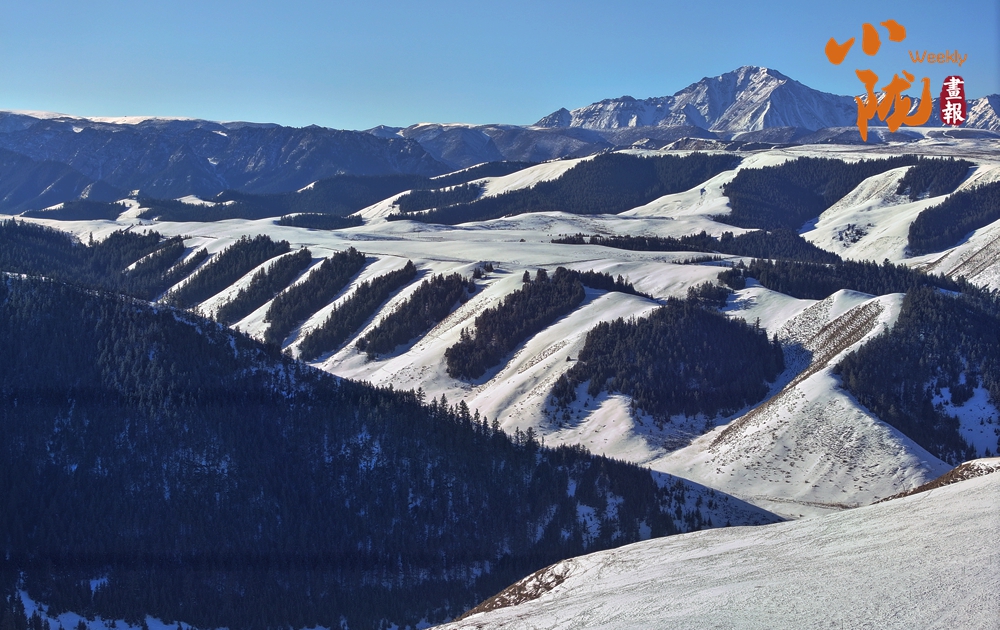 蒼茫草原,皚皚雪峰,松林相互映襯,構(gòu)成一幅美麗的冬日畫卷。