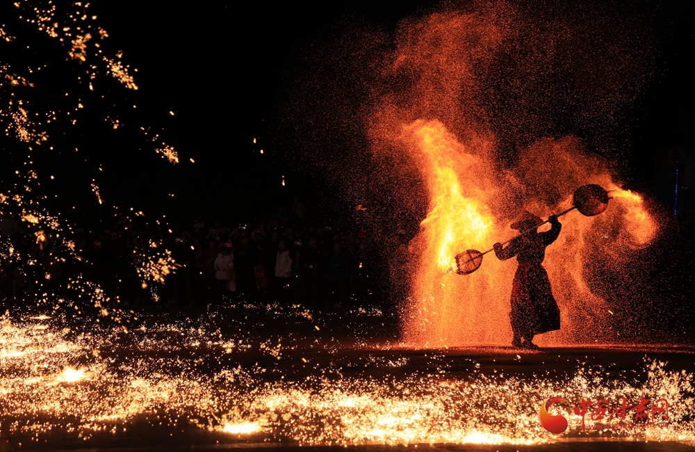 打鐵花表演時(shí),傳承人將生鐵熔到1600℃高溫后,把鐵汁注入“花棒”,用撬棍或木鍬猛擊,使鐵水打上天空四散,形成璀璨絢麗的火樹(shù)銀花景觀。