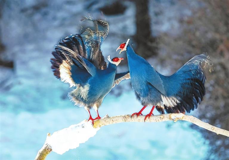藍馬雞是珍稀名貴的禽類,頭側(cè)緋紅,耳羽簇白色、突出于頸部頂上,通體藍灰色,中央尾羽特長而翹起,尾羽披散下垂如馬尾,故名藍馬雞。冬日里,藍馬雞成群飛落山腳覓食,藍羽丹頂行走在雪地上格外搶眼。數(shù)量繁多的藍馬雞是祁連山野生山地雞的“顏值擔(dān)當(dāng)”。覓食時,藍馬雞常用爪刨挖林中空地苔蘚和林緣草地,尋找掉落的云杉種子。刨食的過程會讓土壤松動,便于種子生根發(fā)芽,促進林區(qū)植物天然更新。