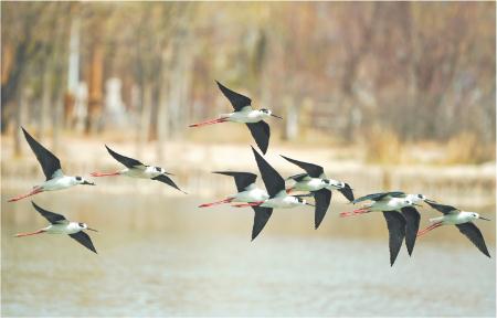 4月9日,一群黑翅長腳鷸在定西湖水面飛行。進(jìn)入4月,候鳥陸續(xù)北遷,定西湖成了眾多鳥群遷徙途中的歇腳補(bǔ)給地。新定西·定西日報(bào)記者 牛小棟 攝