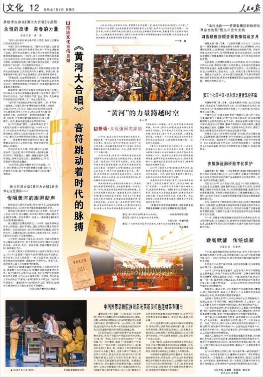6月30日晚,北京音樂廳內(nèi),京津冀藝術(shù)家會聚一堂,奏響交響音樂會《黃河》;不久前,廣東深圳8個合唱團(tuán)、300余名歌者共同演唱《黃河大合唱》,吸引近120萬網(wǎng)友線上觀演……80多年來,從烽火硝煙中誕生的《黃河大合唱》成為跨越時空的回響,承載著中華兒女的共同記憶。從主題展覽到各類演出,《黃河大合唱》的每個音符都跳動著時代的脈搏,讓我們重溫這首抗戰(zhàn)歌曲,感受經(jīng)典作品傳承的永恒力量。