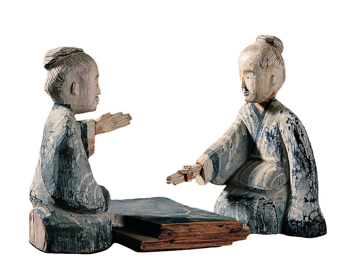 漢代 武威市磨嘴子漢墓出土 人高29厘米。 兩位老者在玩博戲,這是戰(zhàn)國到漢代非常盛行的一種娛樂形式。匠師以簡單明快的藝術造型,刻畫了兩位老者全神貫注的博弈,惟妙惟肖地表現出對弈時蓄勢待發(fā)的場面。