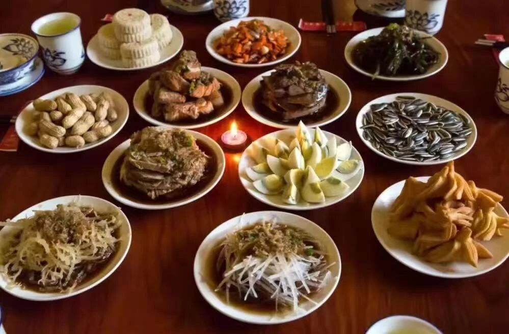 ——“十三花”,寓意胡太后以民為本的執(zhí)政理念;城內(nèi)四個(gè)葷菜,寓意人民四季安康、幸福美滿;骨頭碟和懸肉碟,寓意父骨母血、尊老孝親;肝子碟和雞蛋碟,寓意肝膽相照、心心相?。凰膫€(gè)水菜碟子水圍城,寓意順風(fēng)順?biāo)⑺姆狡桨?;城外瓜籽花生碟,寓意多子多福、多祿多壽;路食和果子,寓意衣豐食足、一路平安;最中間一個(gè)大碟全盤為中心,寓意團(tuán)結(jié)聚力、天下一心。