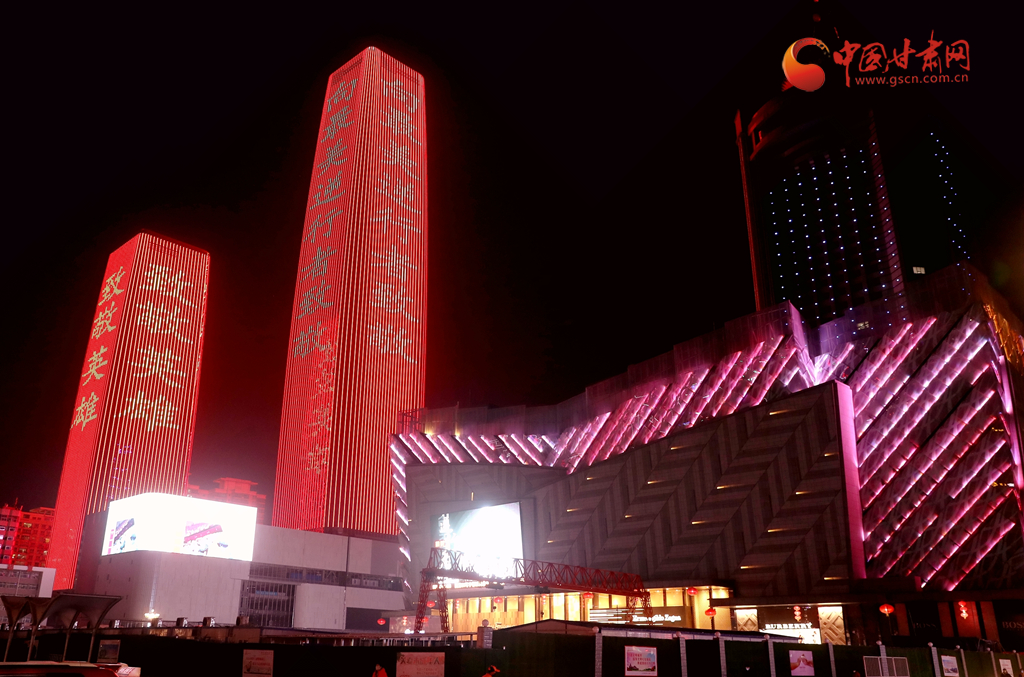 2月21日至23日,蘭州為抗疫一線英雄舉行亮燈活動。這是2月21日鴻運金茂樓體用燈光顯示出“向最美逆行者致敬”“致敬英雄”的文字向英雄致敬。