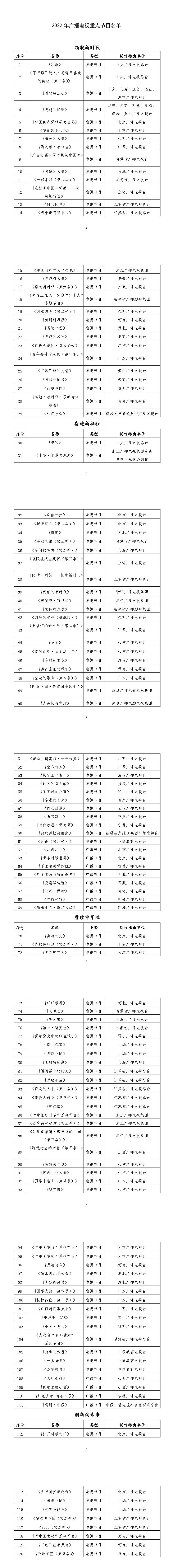 《通知》指出,為做好2022年廣播電視重點節(jié)目創(chuàng)作播出工作,廣電總局認真遴選,聚焦“領(lǐng)航新時代”“奮進新征程”“賡續(xù)中華魂”“創(chuàng)新向未來”四個主題,確定120檔節(jié)目為2022年廣播電視重點節(jié)目。