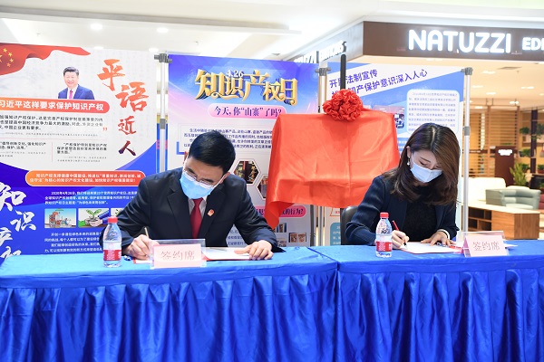 城關(guān)區(qū)法院與居然之家萬佳天水路店,就設(shè)立“知識產(chǎn)權(quán)司法保 護(hù)示范基地”及日常工作的詳細(xì)內(nèi)容簽訂備忘錄。記者 李洋 攝