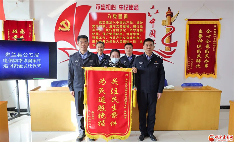 “沒想到還能追回被騙的錢,真心感謝皋蘭縣公安局的民警們。”返還儀式上,楊女士領(lǐng)回被騙資金,連聲道謝,并向辦案民警送上了一面印有“關(guān)注民生案件 為民追贓挽損”的錦旗,感謝民警全力偵辦案件,為自己挽回損失。