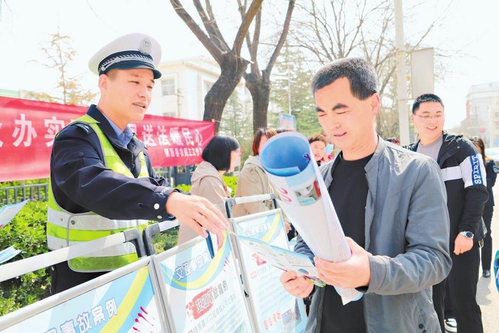民警給過路群眾發(fā)放宣傳資料。4月8日,鎮(zhèn)原縣公安局交警大隊(duì)開展“春風(fēng)送法暖民心”主題宣傳活動(dòng)。新甘肅·甘肅法治報(bào)記者馬志國攝