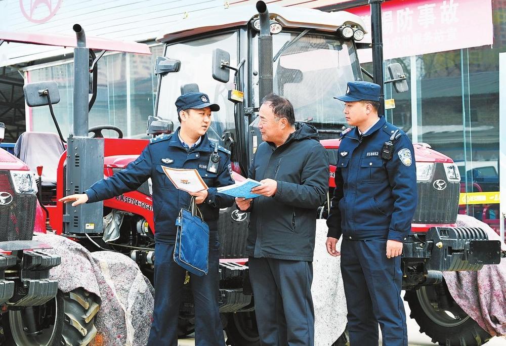 民警向農(nóng)機(jī)經(jīng)營者了解情況。榆中縣公安局城關(guān)派出所民警正在一家農(nóng)機(jī)超市里開展安全檢查,為春耕生產(chǎn)保駕護(hù)航。 新甘肅·甘肅法治報(bào)通訊員張軍揚(yáng)攝