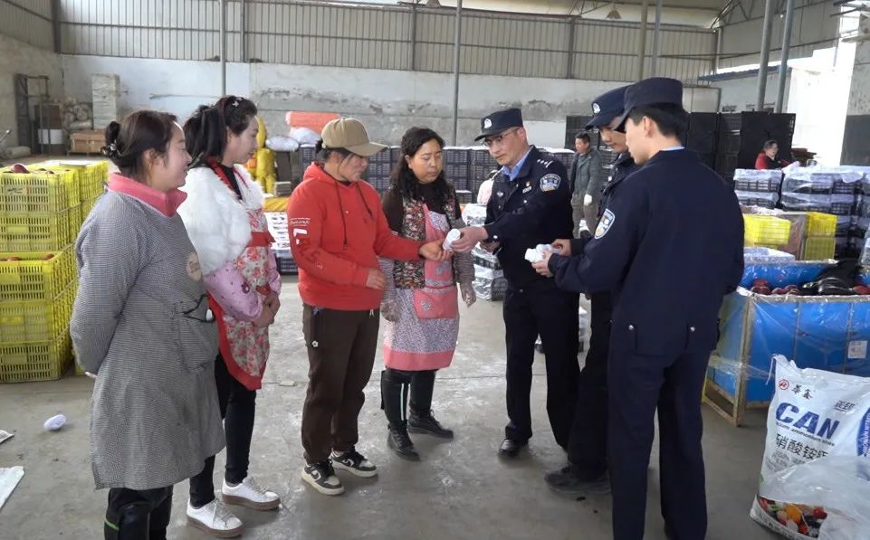 除了巡邏防控和矛盾調(diào)解,花牛派出所還開設了“田間課堂”,向果農(nóng)積極開展普法宣傳。在農(nóng)資市場休息區(qū),民警們拉起橫幅,向果農(nóng)們講解防盜、防騙、防火等安全知識。民警馬嘯不時翻看手機里的微信群說:“我們主動將果農(nóng)納入微信群,不定時推送防騙知識,果農(nóng)們遇到拿不準的情況也會及時向我們咨詢。”