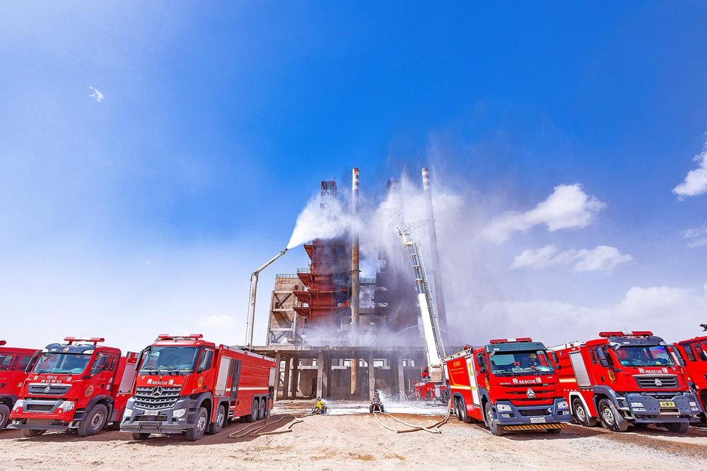 在“次生災(zāi)害滅火救援”科目現(xiàn)場,化工園區(qū)內(nèi)的熊熊烈焰映紅了半邊天。消防員身著隔熱服操控滅火機(jī)器人抵近火源,高噴車噴射出的泡沫如瀑布般覆蓋燃燒裝置,移動炮陣列織就立體火網(wǎng)。從突破火線到追殲火頭,從清理余火到看守火場,救援人員輪替堅(jiān)守在一線,成功阻止火勢的蔓延。