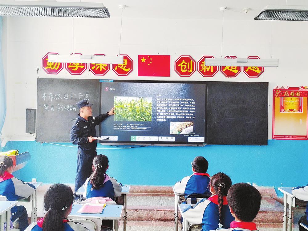 民警正給學(xué)生講解“防范青少年藥物濫用”等禁毒知識。近日,臨潭縣公安局術(shù)布派出所民輔警走進(jìn)轄區(qū)學(xué)校,開展以“防范青少年藥物濫用”為主題的禁毒宣傳活動。 新甘肅·甘肅法治報(bào)記者金凡裕攝