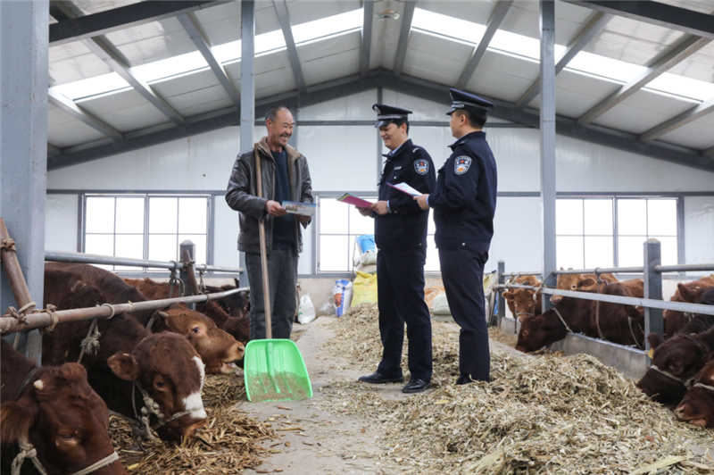 ▲平涼市公安局崆峒分局寨河派出所民輔警深入轄區(qū)紅牛養(yǎng)殖基地,開展針對性普法宣傳活動,進一步筑牢轄區(qū)紅牛養(yǎng)殖產業(yè)法治防線,提升廣大養(yǎng)殖戶的法律意識。(張鏡鏡 攝)
