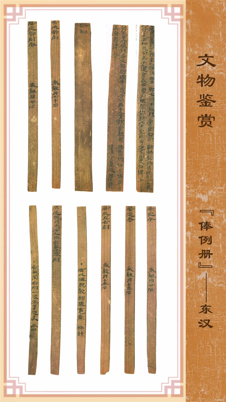 1974年8月出土于甲渠候官遺址第22號(hào)房址內(nèi)。簡(jiǎn)冊(cè)由10枚簡(jiǎn)組成,每簡(jiǎn)長(zhǎng)22.8厘米,前兩簡(jiǎn)寬2.5厘米,其余8簡(jiǎn)寬1.4厘米。全文200字。內(nèi)容為東漢建武三年(公元25年)竇融統(tǒng)治河西期間留下的一份完整的財(cái)政文書(shū)。簡(jiǎn)文是關(guān)于居延都尉府吏員奉谷標(biāo)準(zhǔn)的通知,由領(lǐng)河西五郡大將軍張掖屬國(guó)都尉竇融幕府下發(fā),簡(jiǎn)言“如律令”可知其指令具有法律效力。