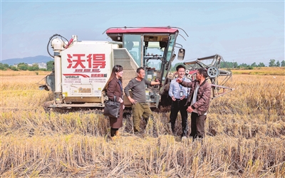 糧食安全是“國(guó)之大者”。安徽省含山縣紀(jì)委監(jiān)委聚焦高標(biāo)準(zhǔn)農(nóng)田建設(shè)管理中的突出問(wèn)題開展一線走訪,推動(dòng)“糧田”變“良田”。圖為該縣紀(jì)檢監(jiān)察干部在環(huán)峰鎮(zhèn)城北村水稻收割現(xiàn)場(chǎng)了解相關(guān)情況。歐宗濤 攝