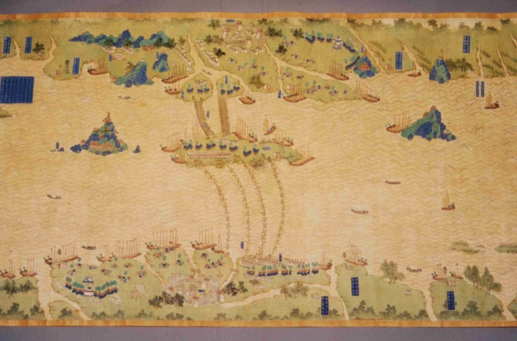 清代,縱59.7厘米,橫1340厘米。采用傳統(tǒng)技法繪制,上南下北,凡江水、港泊、洲渚、城池、村落、林木、山石、舟車、人物、旗幡、軍械均以立體形象呈現,飾以石青、石綠等多種顏色。上起九江、下至鎮(zhèn)江,千里區(qū)域中列攔江纜、攔江牌、戰(zhàn)船、木樓、煙墩、駐軍地、營等各種軍事設施,每營均有金書大榜題,記述本營所處位置及兵力布置狀況,每汛的標題上還記有汛與汛之間的里數。