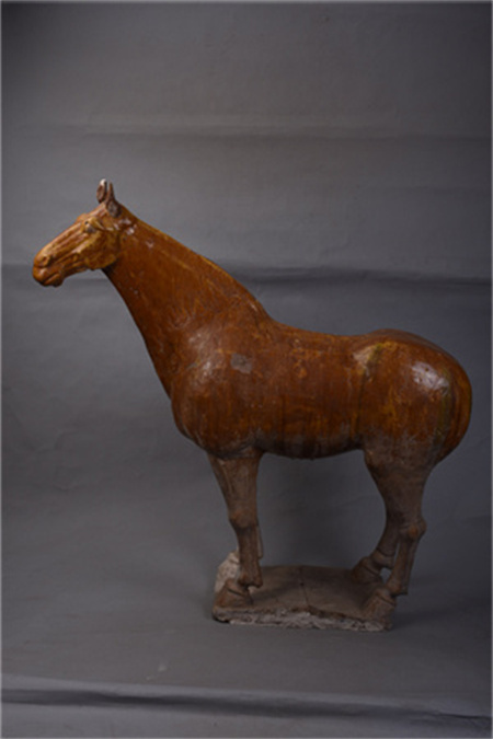 唐代,秦安葉家堡出土,高90.5厘米,長92厘米,寬27厘米。紅陶模制粘合而成,馬四足站立于方形踏板上,通體飾黃釉,塑造出膘肥體壯的駿馬造型。